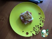 Нижний ломтик хлеба промазываем соусом. Выкладываем на него пластину сыра. На сыр - бекон свёрнутый в рулетики (3 длинных ломтика). Бекон промазываем горчицей зернистой. |