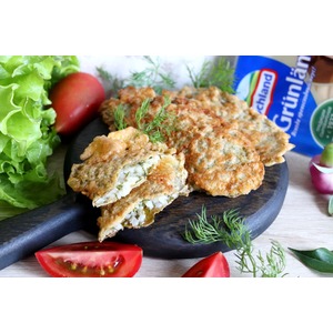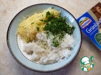 Отварить рис или использовать оставшийся с обеда или ужина. Нарезать укроп. Смешать все вместе. Посолить и поперчить по вкусу, добавить сухой чеснок и мускатный орех. |