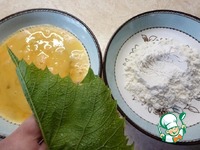 В одну миску разбить яйца и разболтать их. В другую миску насыпать крахмал (или муку). Обвалять виноградные листья в муке, а потом в яйце. |