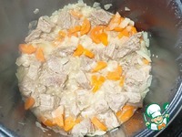 Отправляем в чашу масло и говядину — Режим «Жарка» 10 минут (Не забываем перемешивать каждые 3-4 минуты). |
