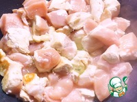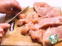 Первым делом куриное филе нарезаем довольно большими кусочками. |