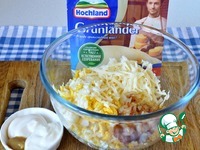 В миске соединить натертые на крупной терке сыр и яйца, добавить жареный лук. Заправить смесью майонеза, йогурта и горчицы. Перемешать, приправить по вкусу. |