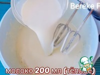 Затем наливаю молоко, растительное масло, далее всыпаю всю просеянную муку, разрыхлитель и теперь взбиваю все миксером. |