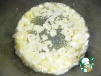 Отправляем в чашу масло и лук — Режим «Жарка» 10 минут (Не забываем перемешивать каждые 3-4 минуты). |