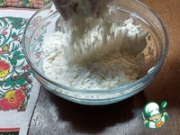 Сюда же натираем на тёрке 100 г холодного сливочного масла. Лёгкими движениями аккуратно растираем тесто в крошку. Делаем это быстро, чтобы масло не начало таять. |