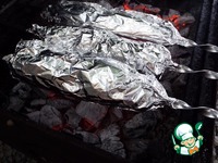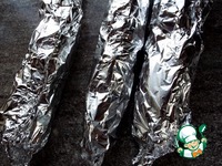 Каждый шампур выложить на кусок фольги. Если фольга тонкая, лучше сделать два слоя. |