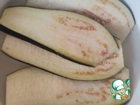 Баклажаны нарезать тонкими пластинами и замочить в подсоленной воде на 15 минут. |