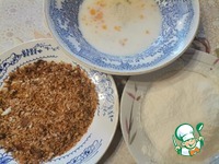 Подготовим все ингредиенты для панировки. Яйцо смешаем с молоком и слегка подсолим. В тарелки насыпем муку и панировочные сухари. |