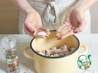 Добавить соль, смесь перцев и чеснок. |