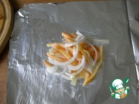 Берём фольгу, отрываем около 50 см. Сбрызгиваем (смазываем) маслом. Условно перегибаем лист фольги пополам. И на одной половине, посредине, кладём овощи. Количество на ваше усмотрение. |