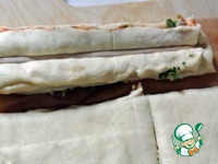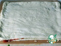 Выложить раскатанный пласт теста бумагой для выпечки вверх на пласт теста с томатной пастой и сыром. Снять бумагу. |