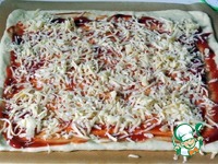 Выложить томатную пасту на раскатанный пласт теста. Распределить ложкой. |