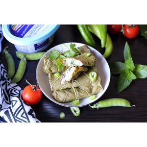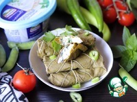 Я предлагаю в виноградные листья завернуть сливочно-творожный сыр с ароматной зеленью, для пикантности добавить чеснока и чили, для свежести цедру и сок лимона.