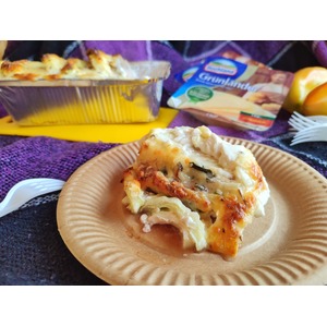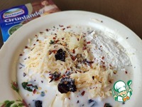 Подготовим соус. Смешаем молоко, крахмал, натертый сыр, щепотку чабреца, пару листиков базилика, перцы и соль. Добавим чеснок. |