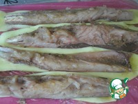 Рыбу разделать на филе, посолить, посыпать специями для рыбы. На пищевую плёнку выложить пластины кабачков, на них сверху выложить филе. |