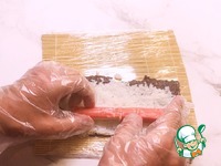 Затем на лист нори выкладываем рис, на рис кладем крабовые палочки и сворачиваем роллы. |