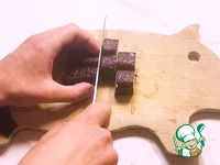 Потом нарезаем на удобные для поедания кусочки при помощи мокрого ножа. |