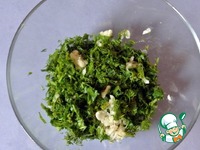 Чеснок пропустить через пресс. Добавить к зелени. |