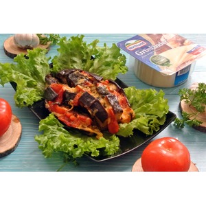 Я выложила баклажаны в фольгу, так мне удобнее было фаршировать. Выложить ломтики сыра. |