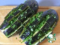 Выложить на противень или в форму для запекания. Каждый баклажан закрыть сверху фольгой. |