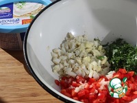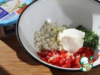 Перец и яйцо мелко порезать. У петрушки мелко порезать только листья. Выдавить чеснок. |