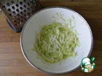 Берём цуккини, если молодой, то оставляем кожуру, если старый, то чистим. Натираем на тёрке, посыпаем солью. |