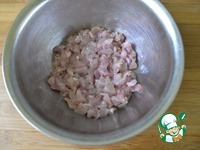 Куриное филе мелко режем, у меня, из бедра, оно нежнее и жирнее, чем из грудки. |