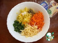 К этому времени картофель и морковь слегка отварились. Картофель, морковь и сыр натрите на крупной терке. Зелень петрушки нашинкуйте. Добавьте соль и перец, все перемешайте. |