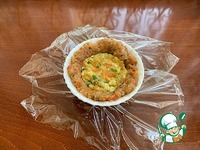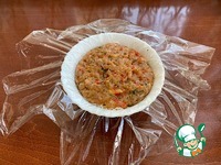 Глубокую пиалку застелите пищевой пленкой. Во внутрь уложите мясной фарш и распределите (влажными руками) по всей пиалке, равномерным слоем. Во внутрь уложите плотным слоем овощную начинку. |