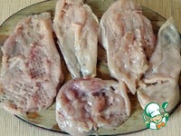 Куриное филе разрезать пополам. Слегка отбить. Посолить, поперчить. |