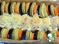 Рататуй - очень овощное блюдо, для сытности я добавила рулетики из куриного филе, фаршированные сыром двух видов.
