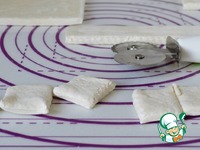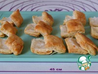 Слоеное тесто нарезать на квадратики со стороной около 1,5-2 см. Выложить их на противень и выпечь в разогретой до 190*С духовке. |