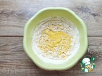 Муку смешайте с разрыхлителем и просейте в миску со смесью. Тщательно перемешайте до однородного, как густая сметана, теста. |