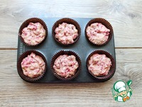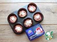 В форму для маффинов положите бумажные формочки для выпечки. В них положите тесто на 1/3 высоты формы. В серединку положите творожный сыр. |