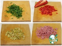 Петрушку вымыть, обсушить и мелко нарезать. Сладкий перец вымыть, обсушить, убрать всё лишнее. Нарезать на маленькие кубики. Так же нарезать оливки и салями. |