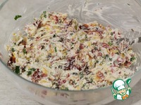 Хорошо перемешать. Должна получиться вот такая нарядная разноцветная сырная начинка. |