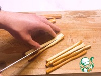После чего копченый сыр нарезаем тоненькими полосочками. |