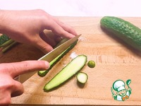 Огурцы нарезаем тонкой соломкой и убираем сочную часть. |