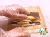 Затем на лист нори выкладываем рис и переворачиваем нори вверх. На нори кладем сыр, огурец, крабовые палочки и сворачиваем роллы. |