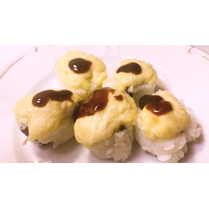 После чего на суши выкладываем сырную шапочку и отправляем в духовой шкаф при 200 градусах на 5 минут. |