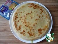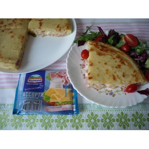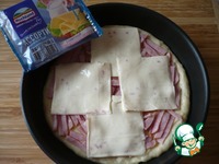 Сверху на лепешку выложите 4 ломтика плавленного сыра ассорти сливочного с ветчиной ТМ "Hochland". |