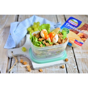 Дополнить еще немного салатом, яйцом и сухариками. Перед употреблением залить подсоленной жидкой сметаной и слегка встряхнуть под крышкой. Приятного аппетита! |
