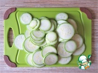 Кабачки тонко нарезать кружочками с помощью специальной терки. Посыпать 0,6 ч. л. соли, перемешать и оставить на 10-15 минут. |