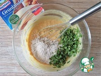 Всыпать цельнозерновую муку и мелко нарезанную зелень кинзы и базилика. |