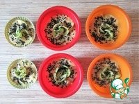 Разложить тесто по формочкам, в центр добавить по 3 скрученных кружочка кабачка в виде розы. Посыпать кунжутом. |