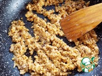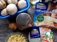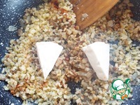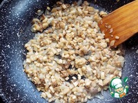 На масле обжарить лук (до мягкости). Добавить грибы и жарить пару минут. |