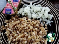 У шампиньонов вырезать ножку и убрать немного мякоти в центре. Лук и грибы мелко нарезать. |