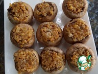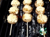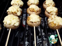 Описание: Фаршированные шампиньоны довольно популярная и полюбившаяся многим горячая закуска!!! А если кто еще не пробовал, то настоятельно рекомендую! Грибная закуска хороша для любого повода, будь то просто пикник с друзьями или же семейное торжество. Впервые делала в качестве начинки булгур и теперь считаю, что это сочетание очень удачно! Крупа с грибами, луком и плавленым сыром гармонично "вписалась" в небольшие шляпки гриба, а сырная шапочка сверху сделала их более нарядными и вкусными. Я готовила грибы на открытом огне, но можно приготовить и в духовке. Допускается, сделать грибы поштучно, но на деревянных шпажках получилось более празднично и интересно!