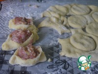 На каждый кружочек положите по 1 ст. л фарша и сформируйте заготовки-лодочки |