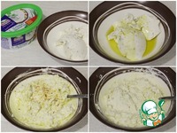 Приготовить сырную намазку. Для этого в миске смешать творожный сыр (у меня с зеленью, но можно взять просто сливочный) с 1-2 ст. л. оливкового масла, добавить сушеный чеснок и снова перемешать. |